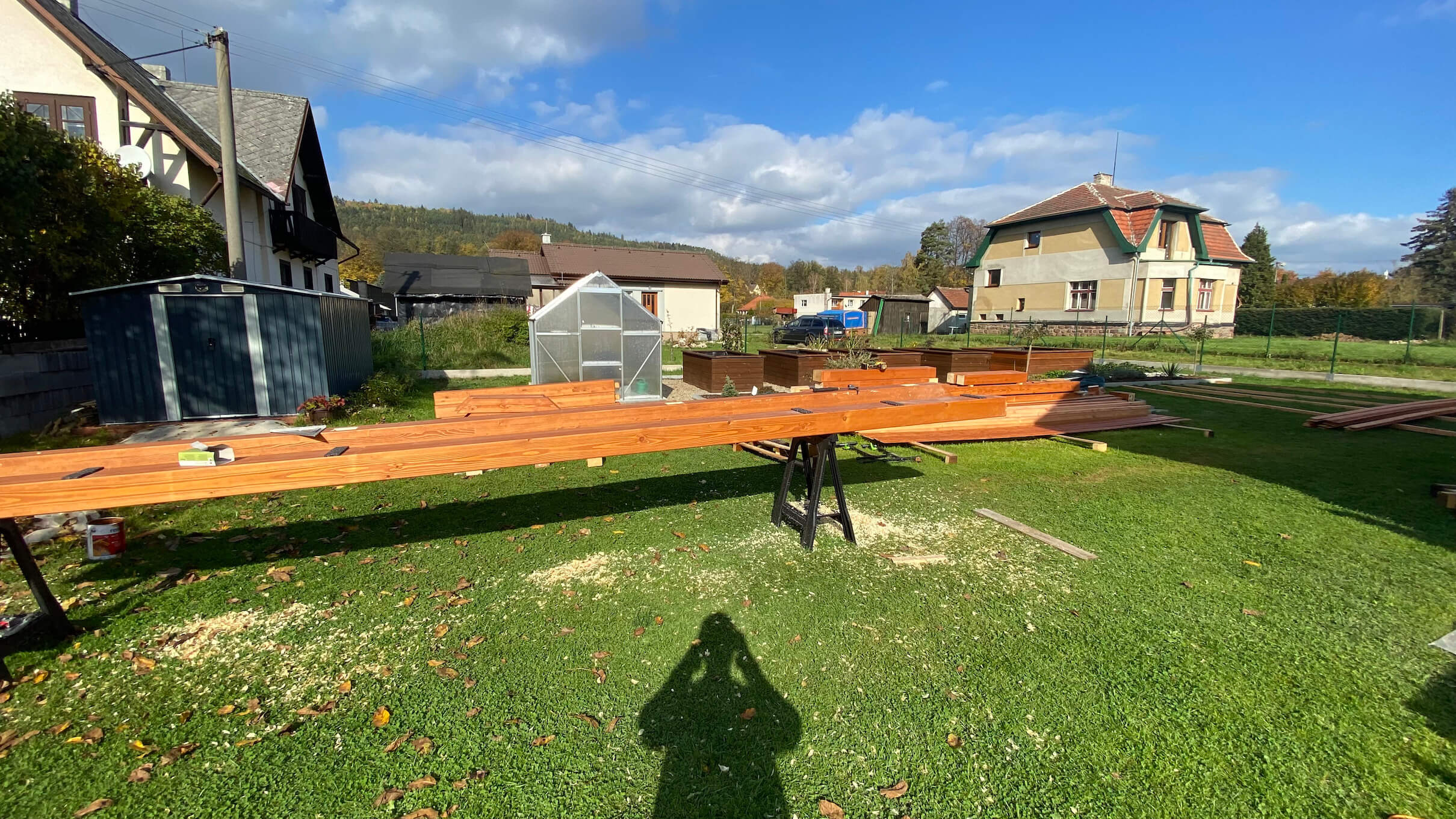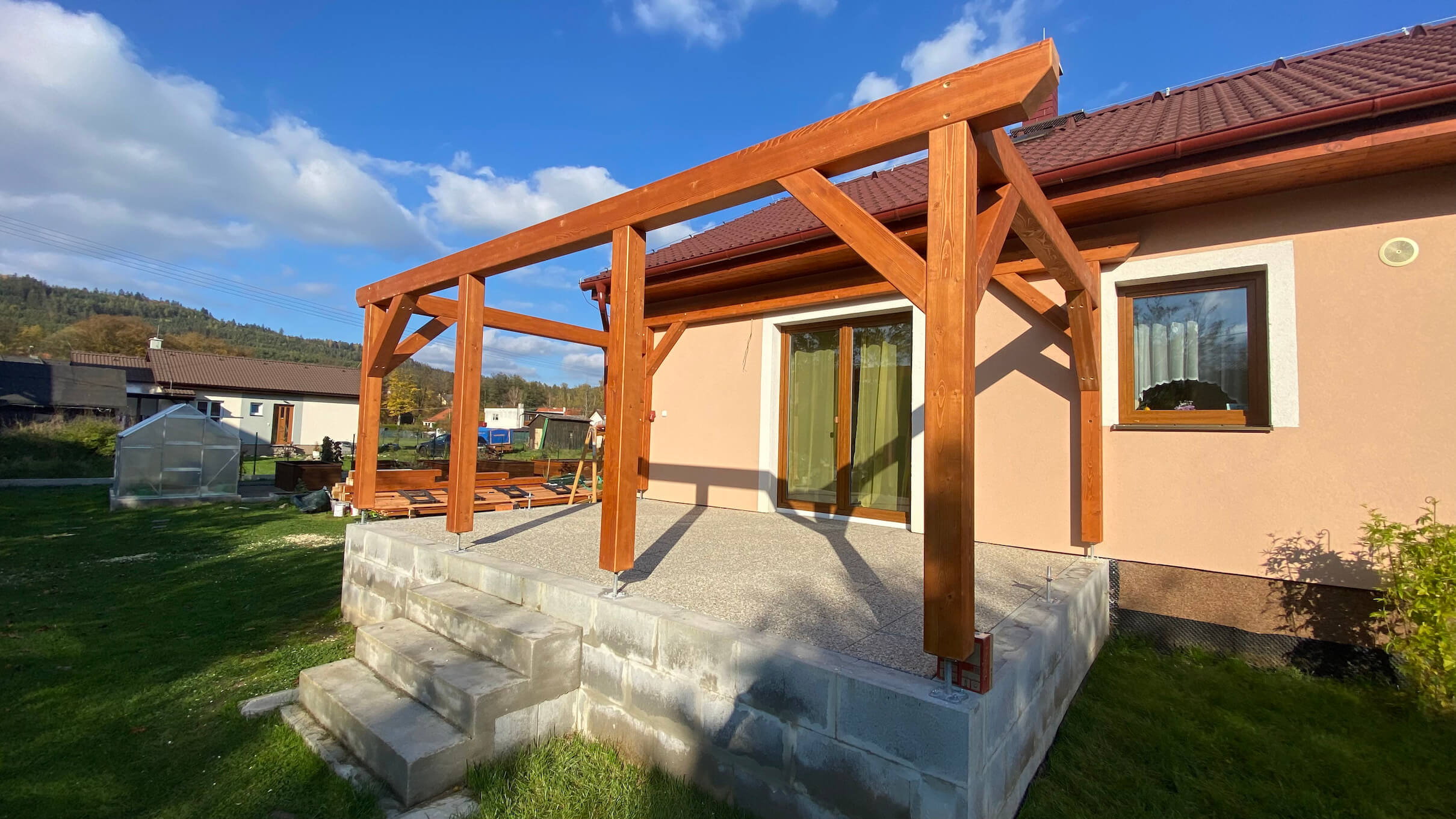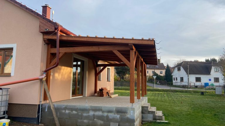 Realizace masivní pergoly z kvalitních BSH hranolů a plechové střechy s imitací tašek.